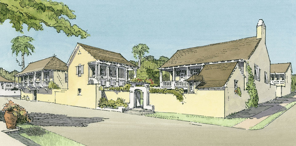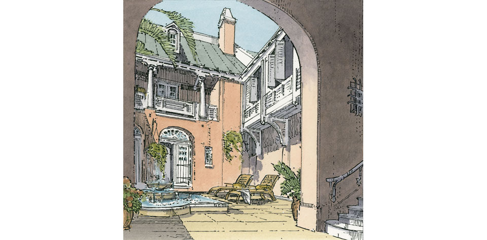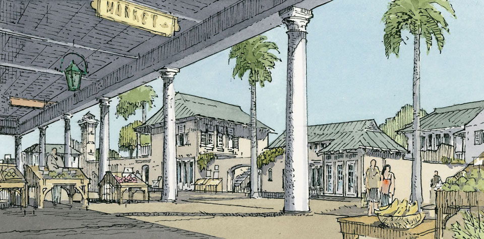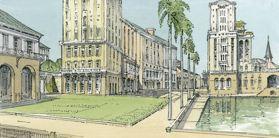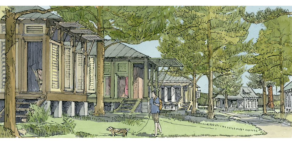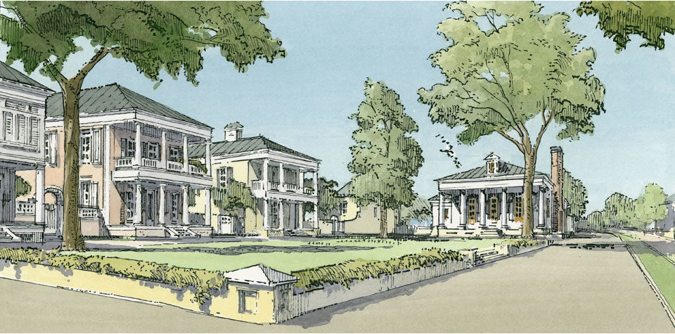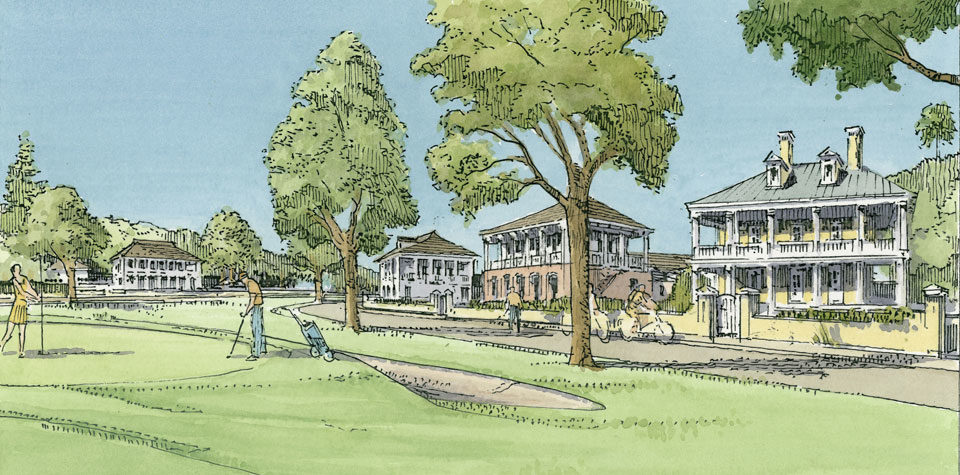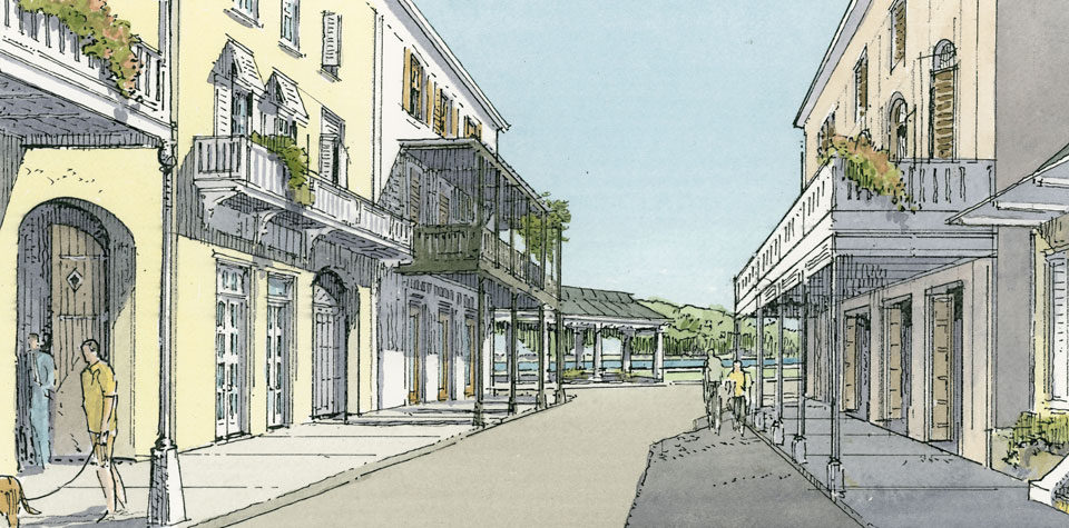 Bon Secour Village was designed to be a true community made up of a diverse group of full-time residents and visitors. Situated on nearly 1,000 acres on the Intracoastal Waterway in Gulf Shores, Alabama, the 1,000-acre site has ample space to accommodate the wide variety of building types, uses, lifestyles, and ages required to construct an authentic and vibrant new town. At the heart of the community lies the marina, which serves as Bon Secour’s central square. Its scale is similar to that of the harbor in Portofino, Italy. The tallest of the town’s buildings are concentrated in this most urban area, along with two towers marking the harbor. Surrounding the marina is a dense network of streets and walkways, designed to serve both pedestrians and vehicles. The second phase is intended to include an interconnected system of canals and a series of small greens and squares weaving throughout the site and culminating in an elegant, world-class golf course. The primary inspiration for the architecture and building types comes from New Orleans. A full range of housing options will be available, including apartments, live-work units, townhouses, courtyard houses, and large single-family homes.