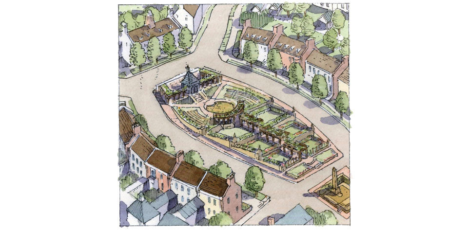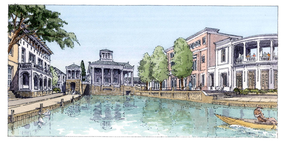 The 409-acre site is located on the northeast corner of Upper Big Springs Road and Davis Road. It straddles a local highway offering advantages of a location near the LeGrange downtown. The site has a beautiful 17-acre pond, several streams and pleasant rolling topography. The site has a number of difficult design constraints: a CSX railroad bordering the north side, I-85 slices the site in half, a high-tension power line dividing the site in quarters, and a petroleum easement that further divides the site. The master plan proposes two neighborhoods which may be connected across by sharing a CSX underpass and a pedestrian bridge over the interstate. The east neighborhood has a small mixed-use center on Big Springs Road with a boulevard connecting it to several neighborhood centers located on high spots within the site. The neighborhood contains a variety of residential building types including dense apartment houses and live-work units. The west neighborhood, at the intersection of Big Springs and Davis Roads, has a denser mixed-use neighborhood center and includes apartment and loft buildings. The pond is the preferred location for the many community amenities including a performing arts center, exercise facilities, outdoor pool, jogging trail, fishing pier, picnic area and an outdoor amphitheater.