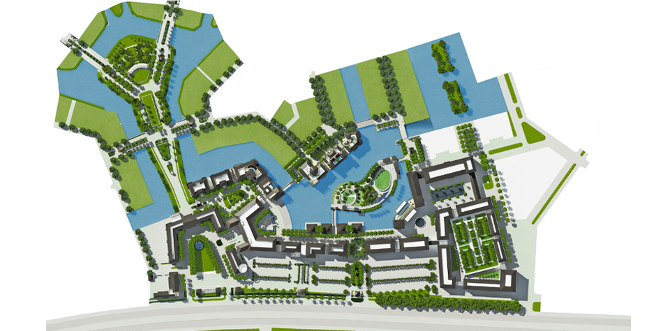 O desenho do plano combina quatro comunidades residenciais e um Town Center com uma rede orgânica de canais venezianos, lagos e ilhas. O sistema de hidrovias desempenha múltiplos papéis ofrecendo vistas panorâmicas e pitorescas, criando oportunidades de lazer, funcionando como um sistema ecológico que favorece a expansão continuada da fauna e da oportunidade de viver em estreito contacto com a natureza.